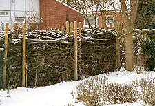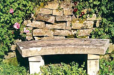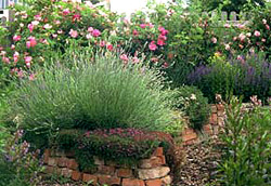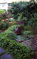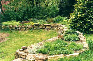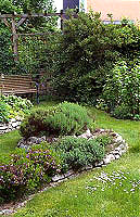 Entspannungsgarten: Trockenmauerbeet mit Rosen, Kräutern und Stauden, Mulchweg mit wegbegleitenden Schattenstauden, Weidenflechtzaun, Sprudelstein, Benjeshecke