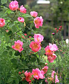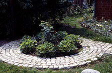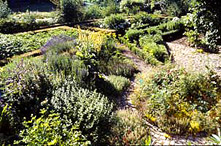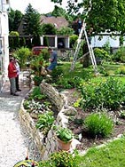 Paradiesgarten: vorhandener Nutzgarten mit Buchshecken wurde erweitert, Kräuterspirale, Schotterbeet mit Wildpflanzen, Wege mit Kalksteinpflaster mit zwei Rosenrondellen, grüner Gang verbindet die Gartenräume