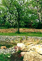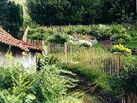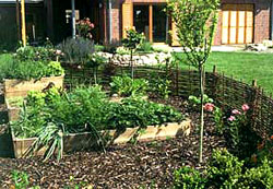 Trockener Bachlauf, Sumpfbeete auf verschiedenen Ebenen, versenkte Terasse mit Trockenmauern, Kopfweiden mit lebendem Weidenzaun, Kindergarte, Wildsträucherhecke, Hochbeete, Rosenpavillion