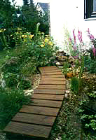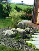 kleiner Teich mit Sprudelquelle, Trockenmauerbeet aus alten Pflastersteinen, geschwungener Holzsteg als verbindendes und erschließendes Element