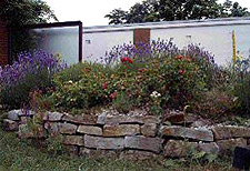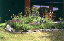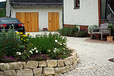 Kalkschotter-Einfahrt mit vielen Wildstauden, Kräuterspirale, Rosenbeet und Blumenwiese im Vorgarten, Dachwasserweiterleitung in einer offenen Rinne seitlich am Haus entlang über mehrere Sumpfbeete in den Teich, mit geschwungenen Trockenmauern gefasste Beete, Rosenbogen in den hinteren Gartenteil