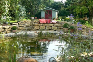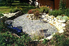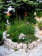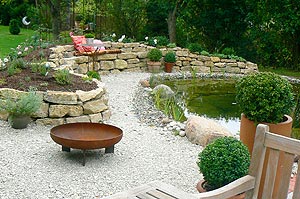 Teich mit Feuerplatz, Trockenmauerbeet mit Sitzplatz aus Steinen