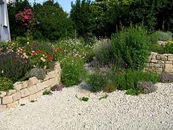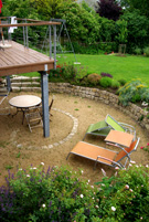 Trockenmauerbeete, Kalkschotterwege, Spielplatz, Einfahrt mit sonnigen Beeten, Feuerplatz